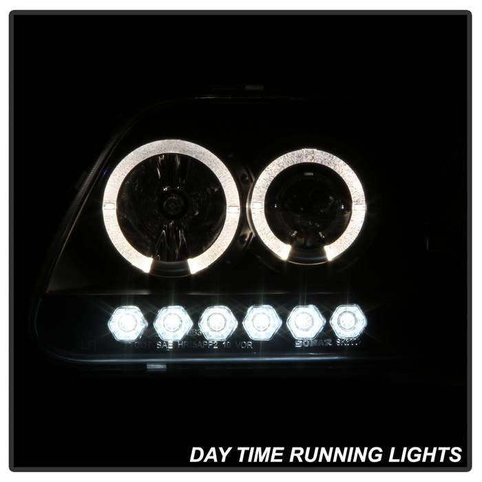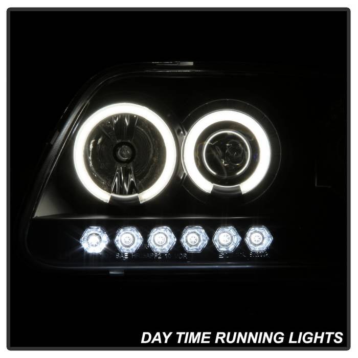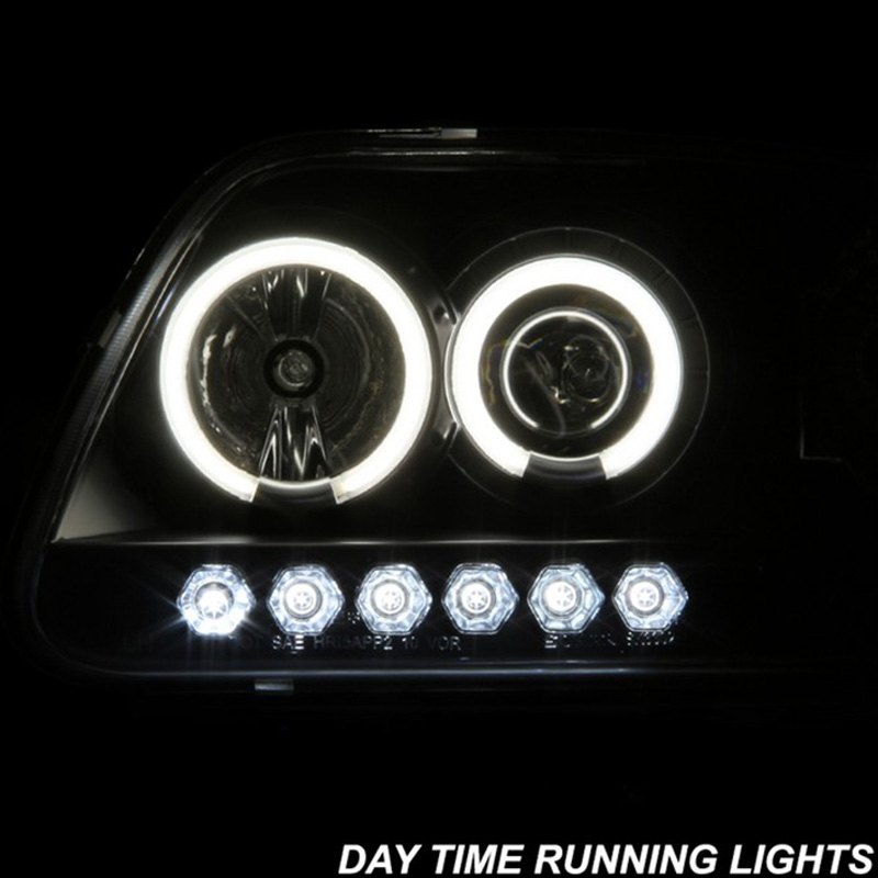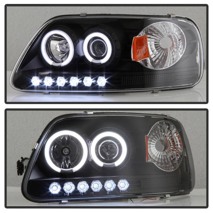 Ford F-150 2001, Signature Series Driver and Passenger Side Black Halo Projector Headlights with Parking LEDs by Spyder®. 1 Pair. Black housing, clear lens. Bulb: H3 low beam (included), 9005 (HB3) high beam (included). Backed by a 1-year warranty. Improve your vision and your vehicle’s appearance with these bolt-on headlight assemblies. The projector beam headlights will produce a sharper, more focused beam of light for safer driving at night, the bright Halos and LED lights will make your vehicle more visible to other drivers, and the Halos, LEDs and custom headlight housing will give your ride an exclusive, unique look. Meets all federal regulations for street use.