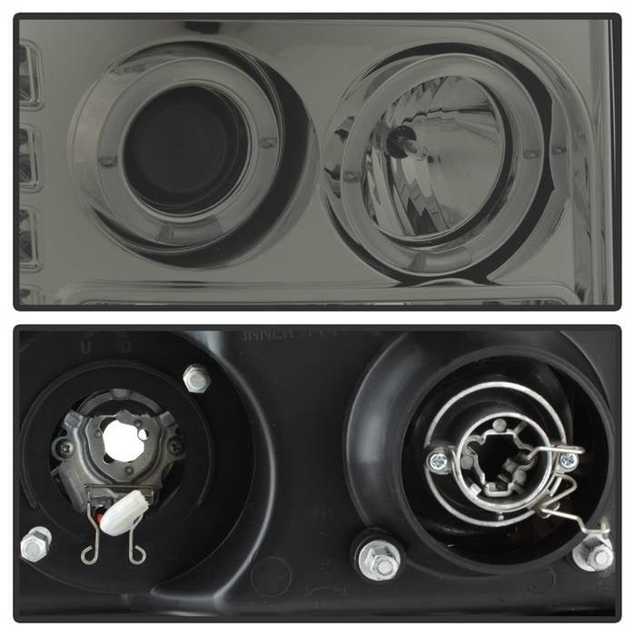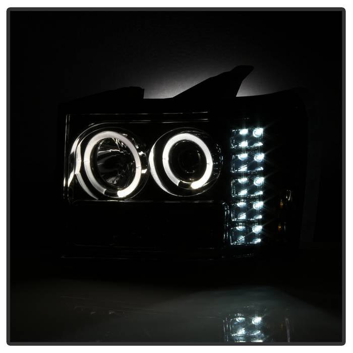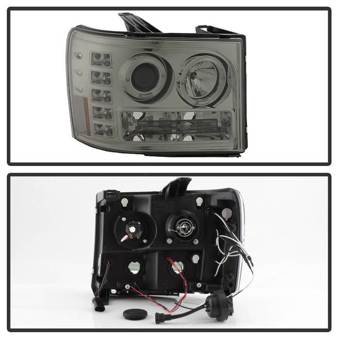 GMC Sierra 1500 2008, Signature Series Driver and Passenger Side Chrome/Smoke Halo Projector Headlights with Parking LEDs by Spyder®. 1 Pair. Chrome housing, smoke lens. Bulb: H1 low beam (included), H1 high beam (included). Backed by a 1-year warranty. Improve your vision and your vehicle’s appearance with these bolt-on headlight assemblies. The projector beam headlights will produce a sharper, more focused beam of light for safer driving at night, the bright Halos and LED lights will make your vehicle more visible to other drivers, and the Halos, LEDs and custom headlight housing will give your ride an exclusive, unique look.