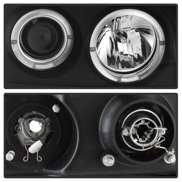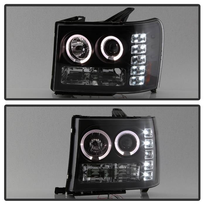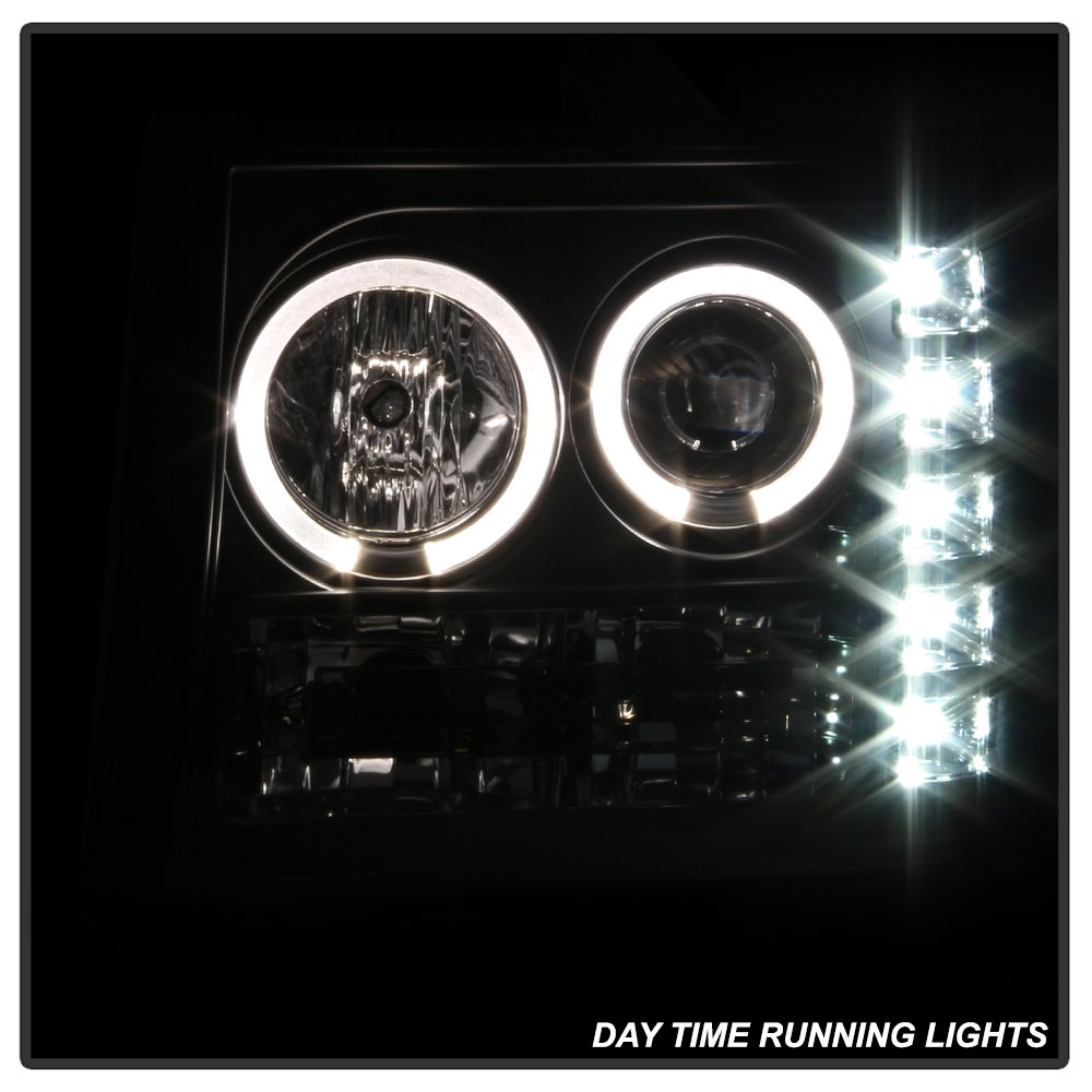 GMC Sierra 2011, Signature Series Driver and Passenger Side Black Halo Projector Headlights with Parking LEDs by Spyder®. 1 Pair. Black housing, clear lens. Bulb: H1 low beam (included), H1 high beam (included). Backed by a 1-year warranty. Improve your vision and your vehicle’s appearance with these bolt-on headlight assemblies. The projector beam headlights will produce a sharper, more focused beam of light for safer driving at night, the bright Halos and LED lights will make your vehicle more visible to other drivers, and the Halos, LEDs and custom headlight housing will give your ride an exclusive, unique look. Meets all federal regulations for street use.