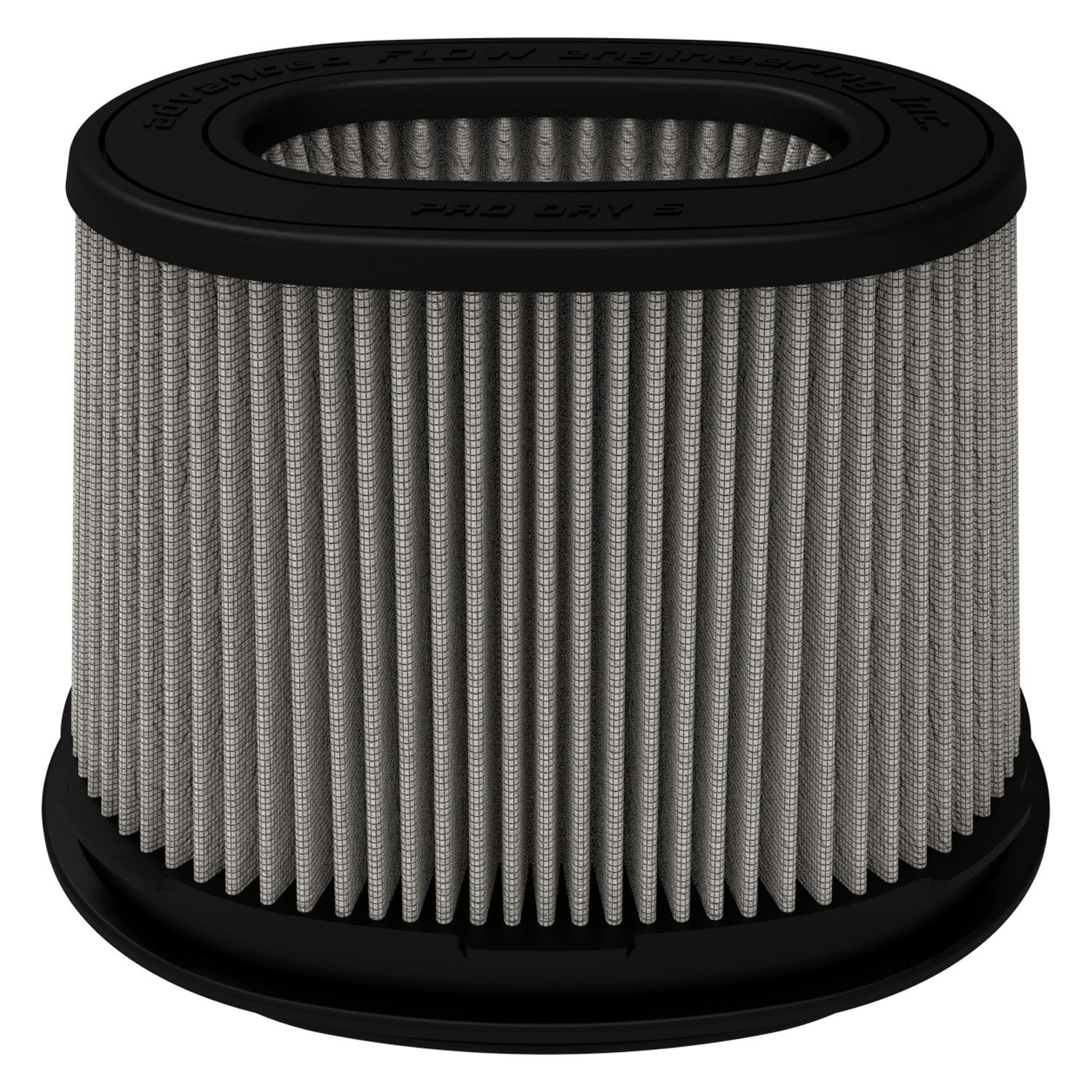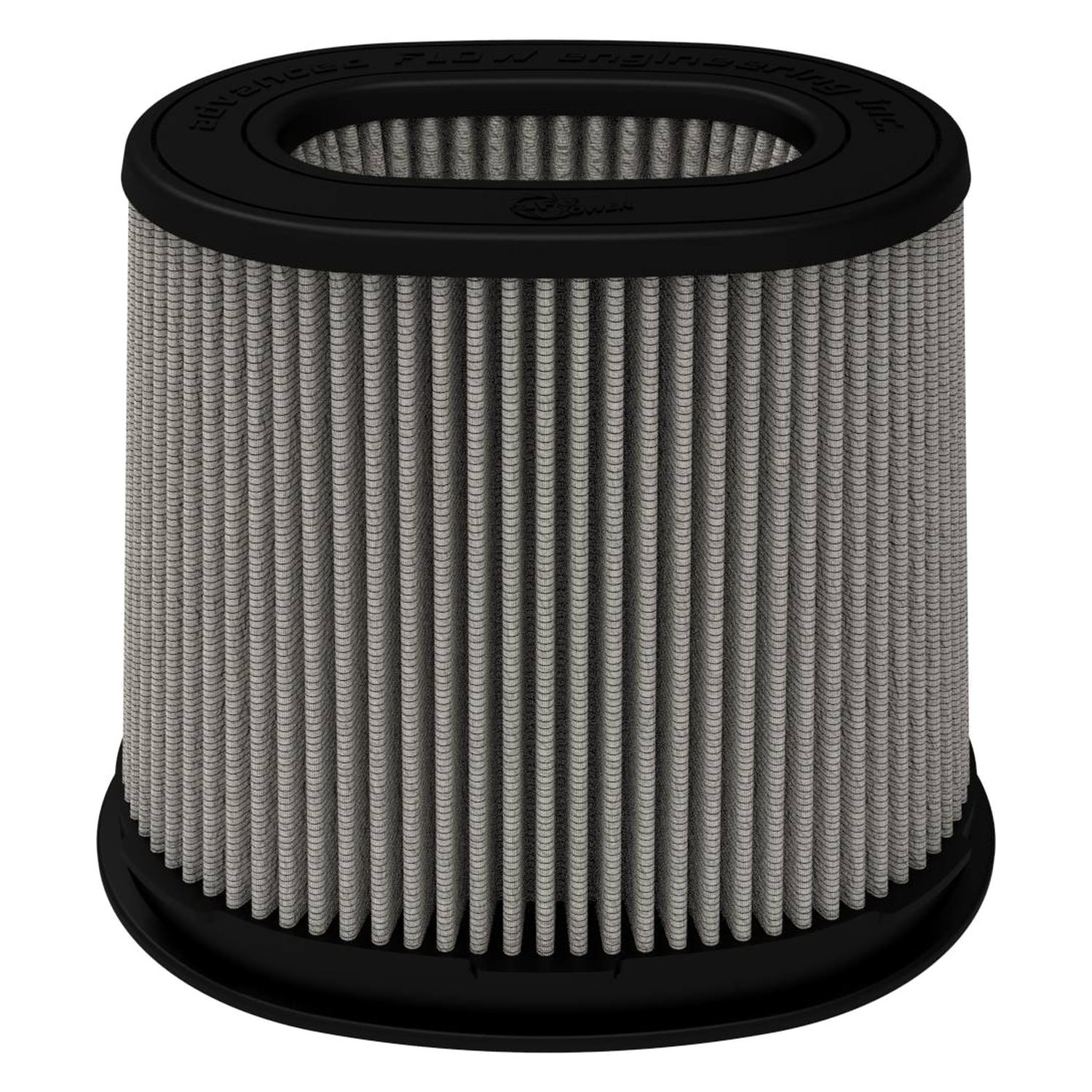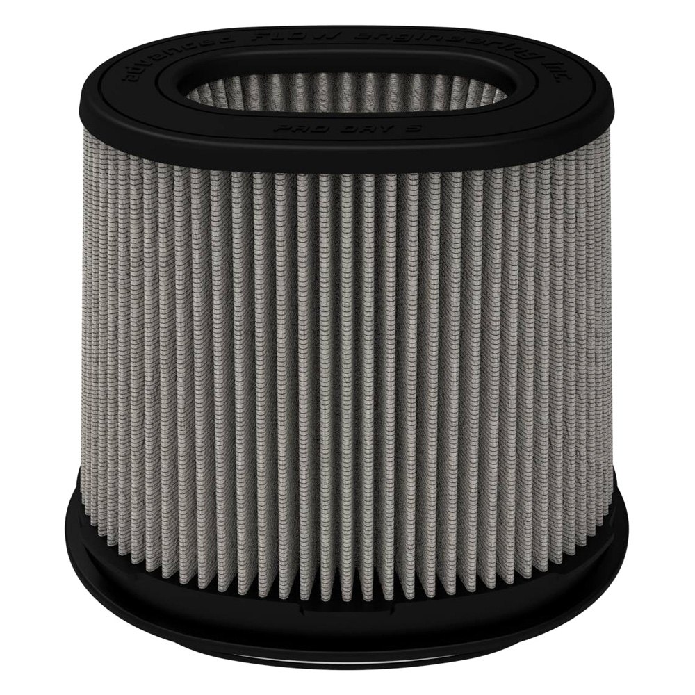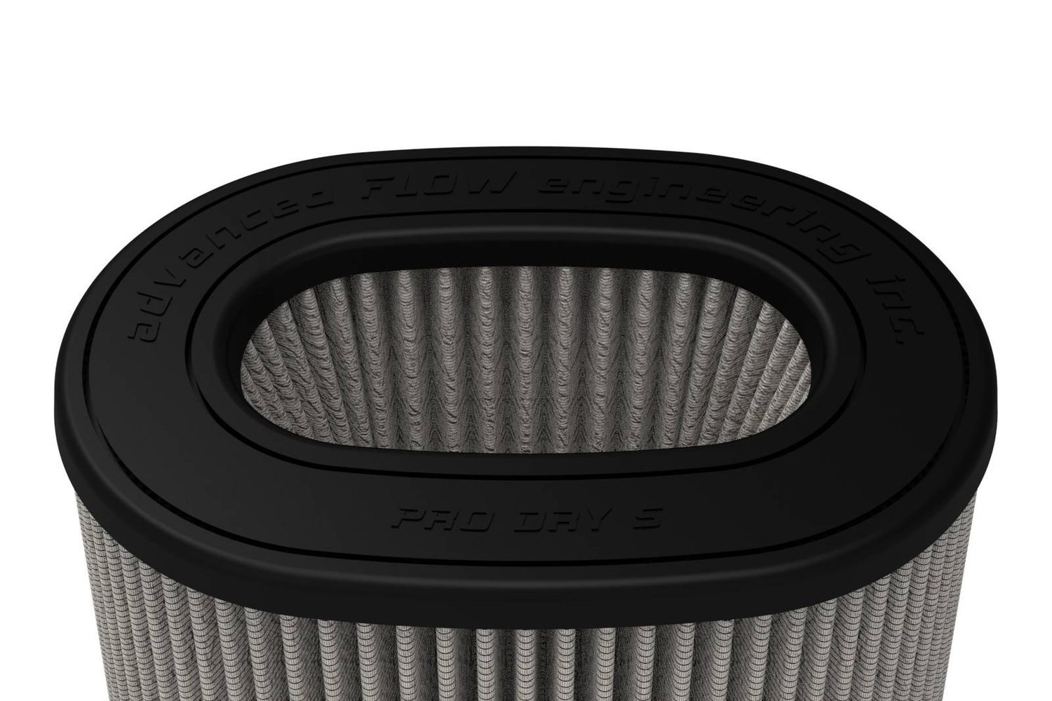 Magnum Flow® Pro Dry S Oval Tapered Gray Air Filter by aFe®. These high flow Pro DRY S air filters are constructed with 100% polyurethane on all sides and will out flow the stock paper filters for improved performance. With three layers of progressively finer mesh synthetic media between 100% polyurethane top and base, this high flow, "oil-free" conical performance filter provides maximum convenience and easy maintenance with excellent airflow. Washable and reusable for multiple cleanings, the tall open evenly spaced pleats provide excellent dust holding capacity for longer service cycle between cleanings. Pliable polyurethane flange with integrated bumps insures tight, no leak seal over the life of the filter. This filter has a 99.2% filter efficiency.