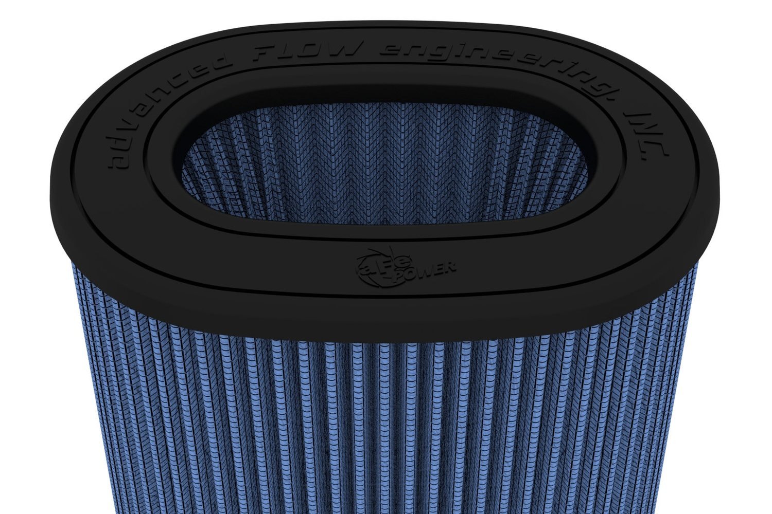 Magnum Flow® Pro 5R Oval Tapered Blue Air Filter (24-91105) by aFe®. These high flow Pro 5R air filters are constructed with 100% polyurethane on all sides and will out flow the stock paper filters for improved performance. Five layers of progressively finer cotton media provides maximum air flow. Washable and reusable for multiple cleaning cycles, the tall, open and evenly spaced filter pleats provide excellent dust holding capacity for longer service cycle between cleanings. An integrated urethane bump seal insures a tight, leak-free seal over the life of the filter. The aFe filter system increased air flow 25% over the factory air filter set increasing horsepower, torque and improving throttle response.