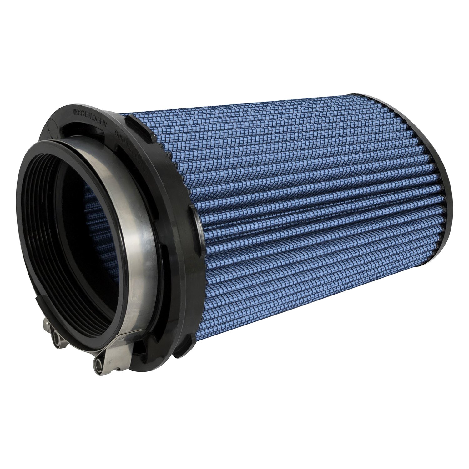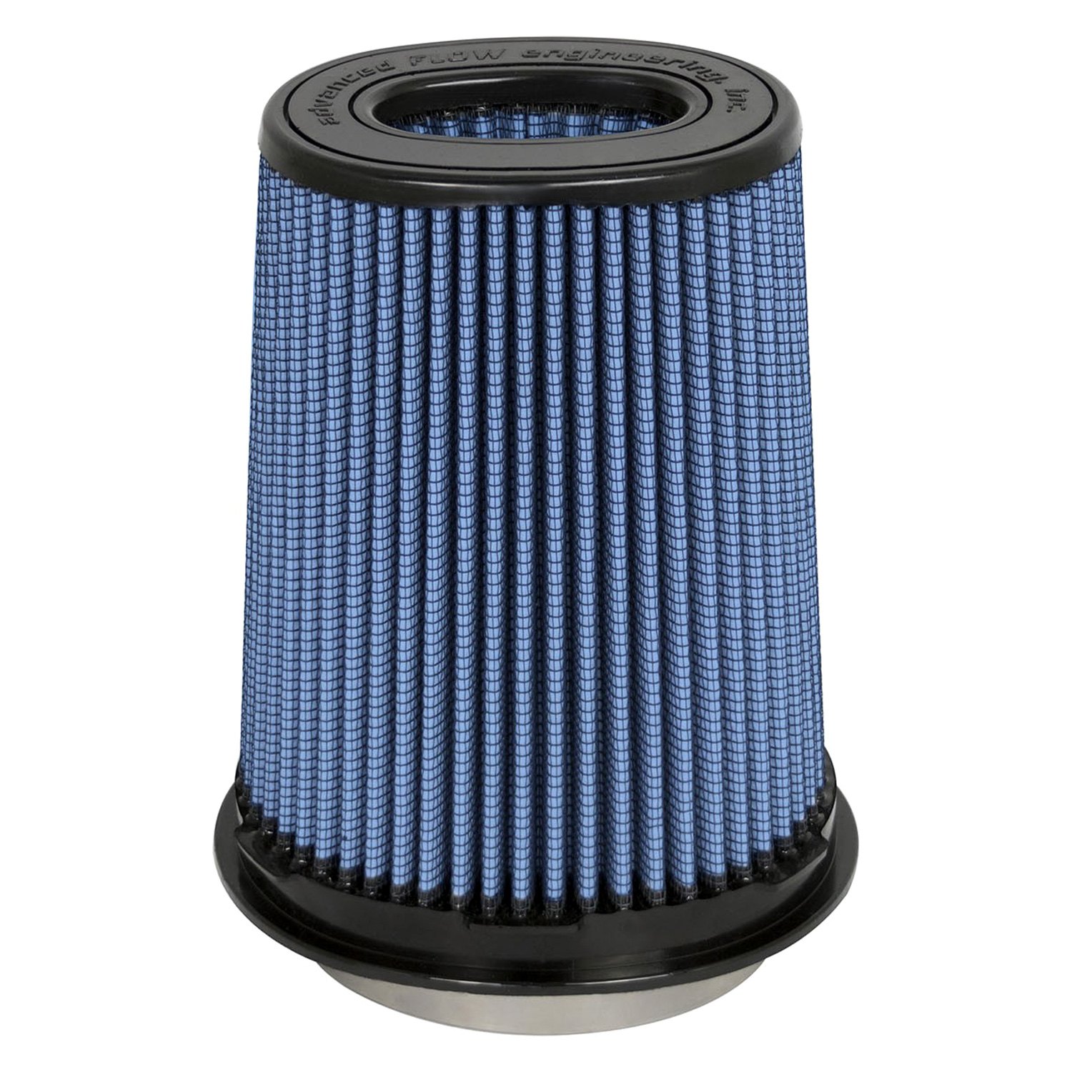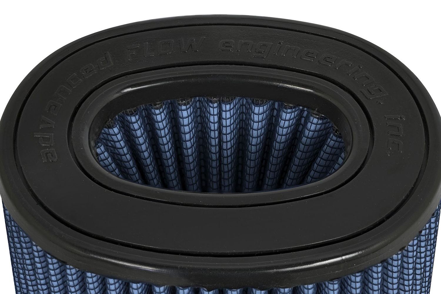 Magnum Flow® Pro 5R Oval Tapered Blue Air Filter (24-91106) by aFe®. These high flow Pro 5R air filters are constructed with 100% polyurethane on all sides and will out flow the stock paper filters for improved performance. Five layers of progressively finer cotton media provides maximum air flow. Washable and reusable for multiple cleaning cycles, the tall, open and evenly spaced filter pleats provide excellent dust holding capacity for longer service cycle between cleanings. An integrated urethane bump seal insures a tight, leak-free seal over the life of the filter. The aFe filter system increased air flow 25% over the factory air filter set increasing horsepower, torque and improving throttle response.