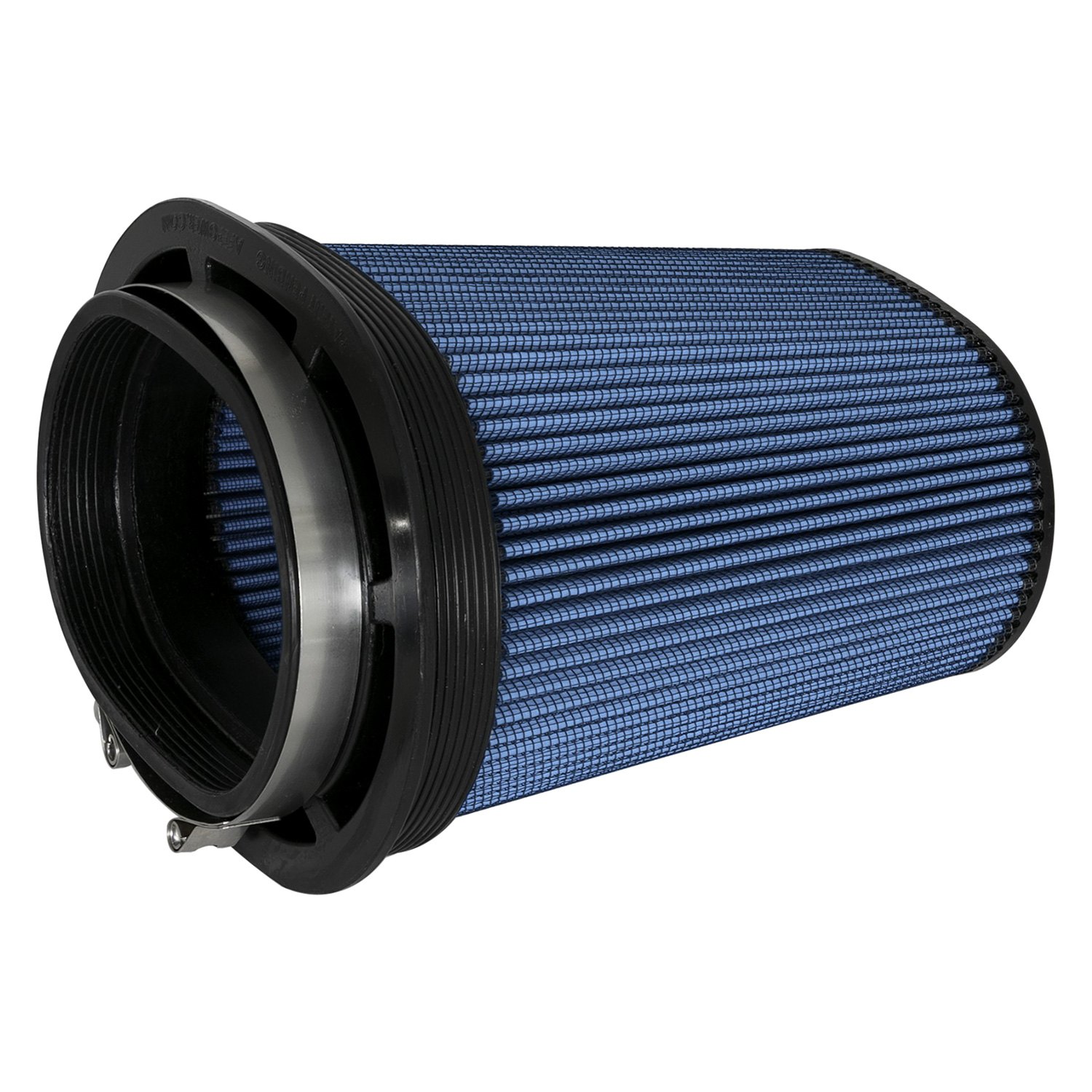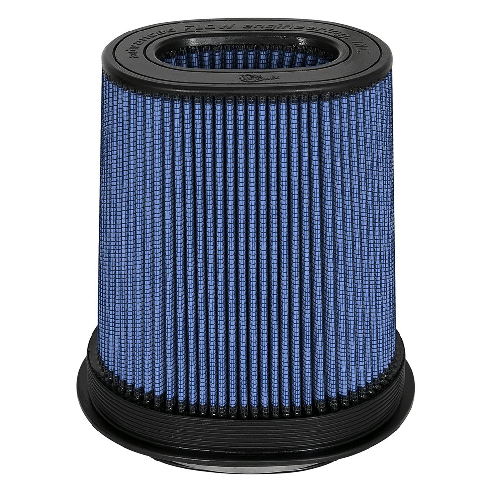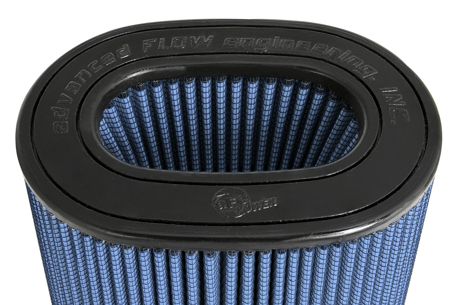 Magnum Flow® Pro 5R Oval Tapered Blue Air Filter (24-91123) by aFe®. These high flow Pro 5R air filters are constructed with 100% polyurethane on all sides and will out flow the stock paper filters for improved performance. Five layers of progressively finer cotton media provides maximum air flow. Washable and reusable for multiple cleaning cycles, the tall, open and evenly spaced filter pleats provide excellent dust holding capacity for longer service cycle between cleanings. An integrated urethane bump seal insures a tight, leak-free seal over the life of the filter. The aFe filter system increased air flow 25% over the factory air filter set increasing horsepower, torque and improving throttle response.