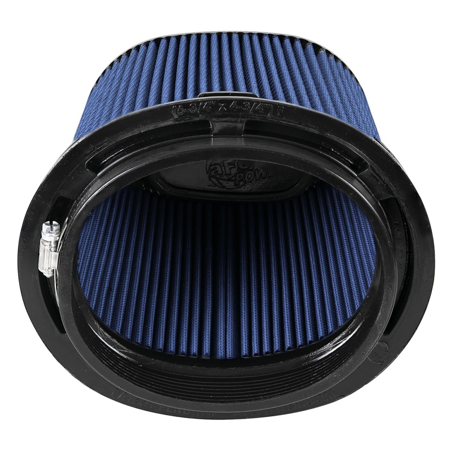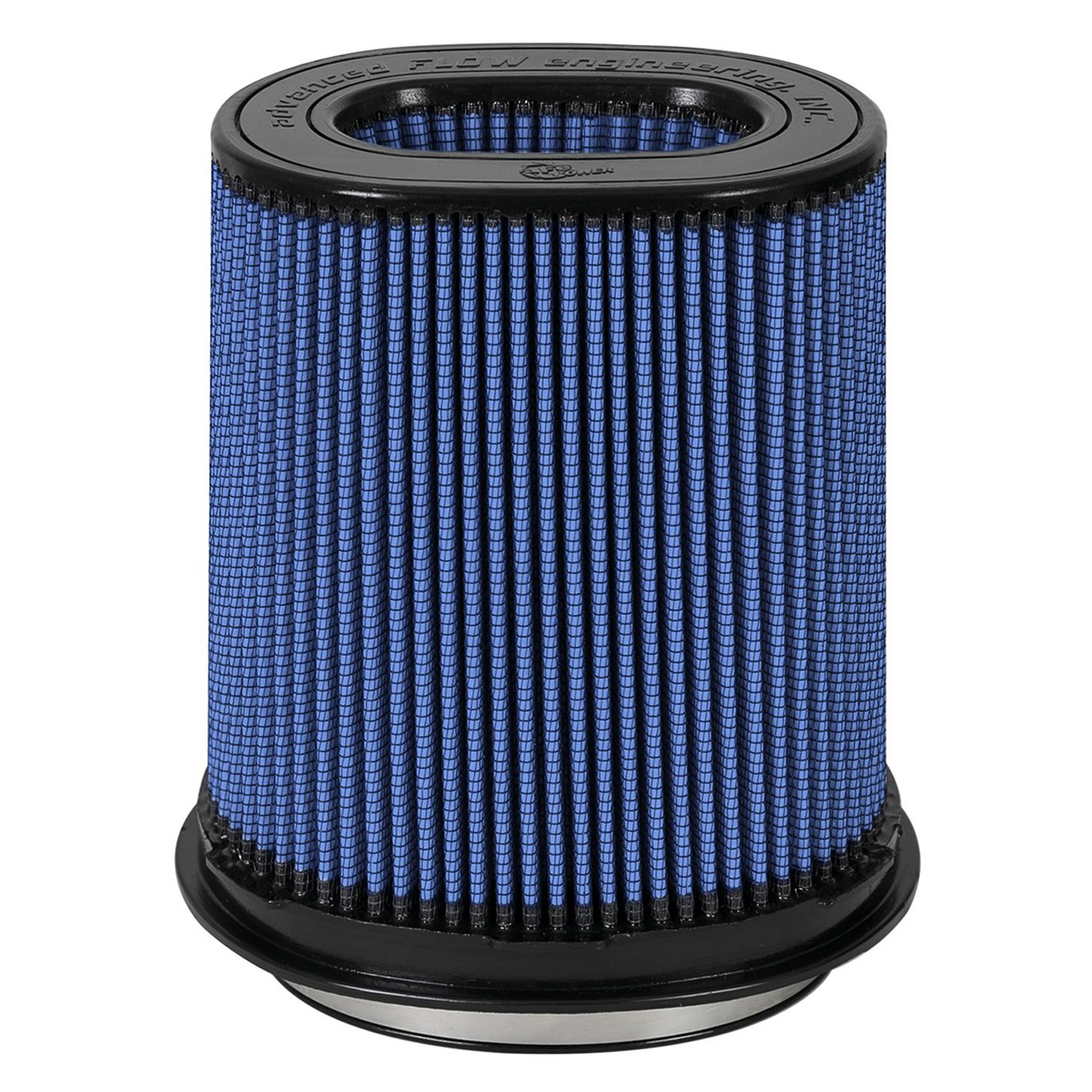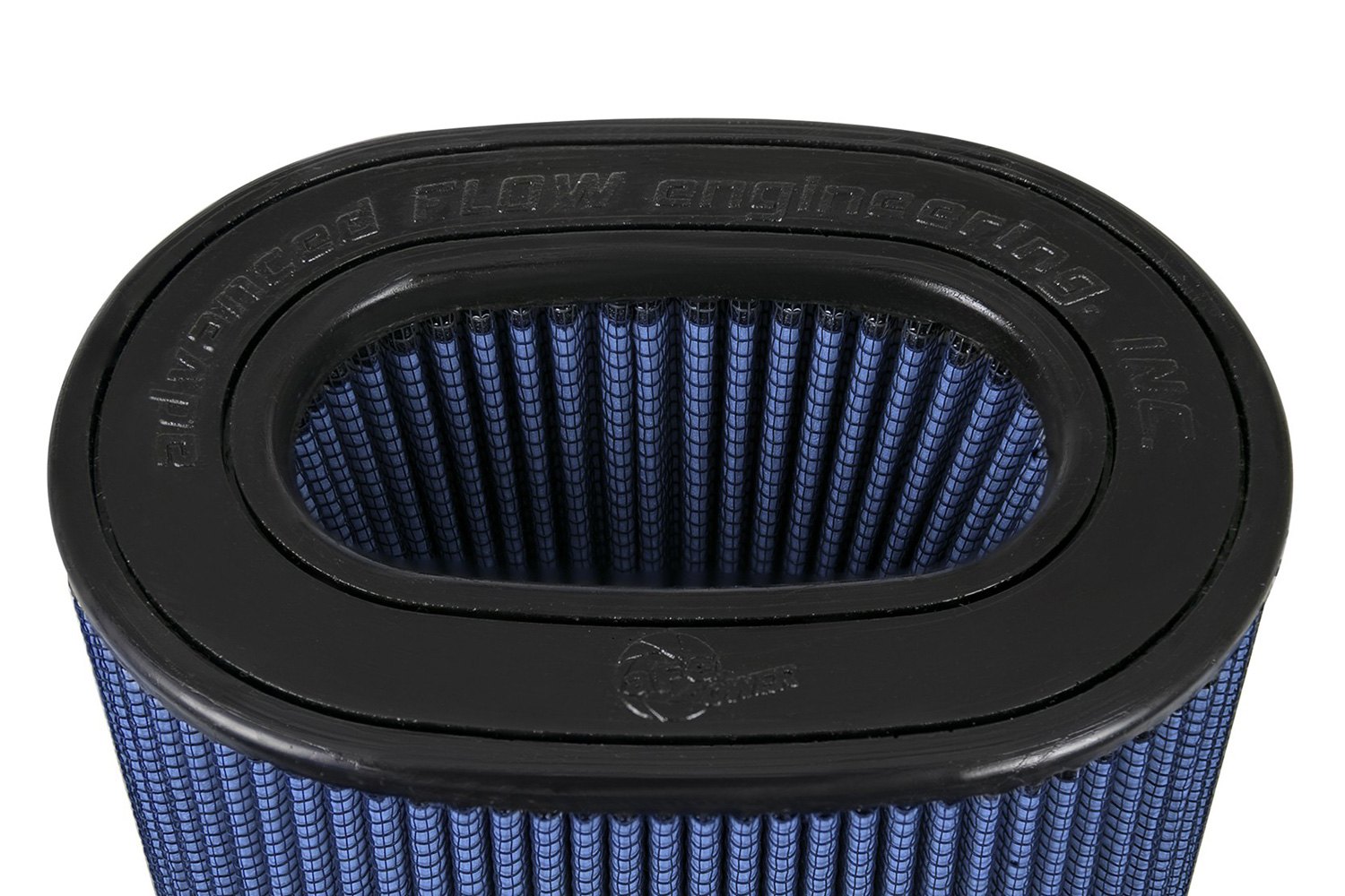 Magnum Flow® Pro 5R Oval Tapered Blue Air Filter (24-91143) by aFe®. These high flow Pro 5R air filters are constructed with 100% polyurethane on all sides and will out flow the stock paper filters for improved performance. Five layers of progressively finer cotton media provides maximum air flow. Washable and reusable for multiple cleaning cycles, the tall, open and evenly spaced filter pleats provide excellent dust holding capacity for longer service cycle between cleanings. An integrated urethane bump seal insures a tight, leak-free seal over the life of the filter. The aFe filter system increased air flow 25% over the factory air filter set increasing horsepower, torque and improving throttle response.