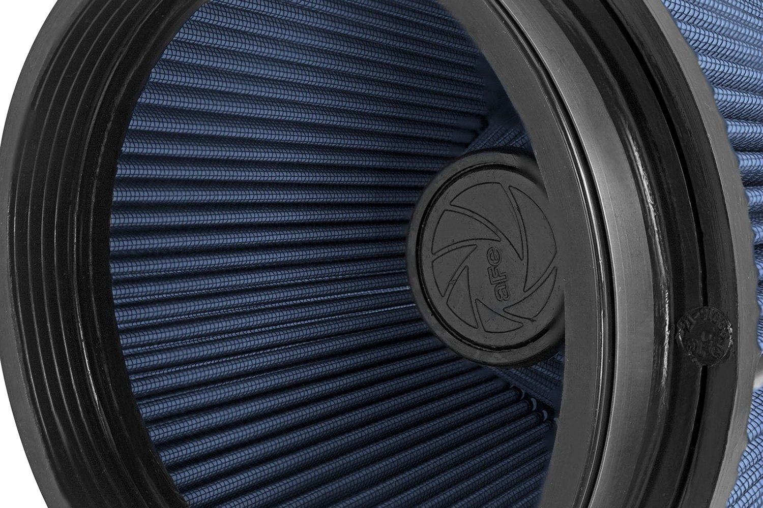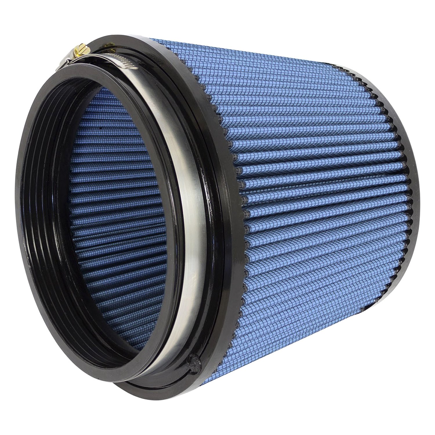 Magnum Flow® Pro 5R Round Tapered Blue Air Filter (24-91055) by aFe®. This high flow Pro 5R air filters are constructed with 100% polyurethane on all sides and will out flow the stock paper filters for improved performance. Five layers of progressively finer cotton media provides maximum air flow. Washable and reusable for multiple cleaning cycles, the tall, open and evenly spaced filter pleats provide excellent dust holding capacity for longer service cycle between cleanings. An integrated urethane bump seal insures a tight, leak-free seal over the life of the filter. The aFe filter system increased air flow 25% over the factory air filter set increasing horsepower, torque and improving throttle response.