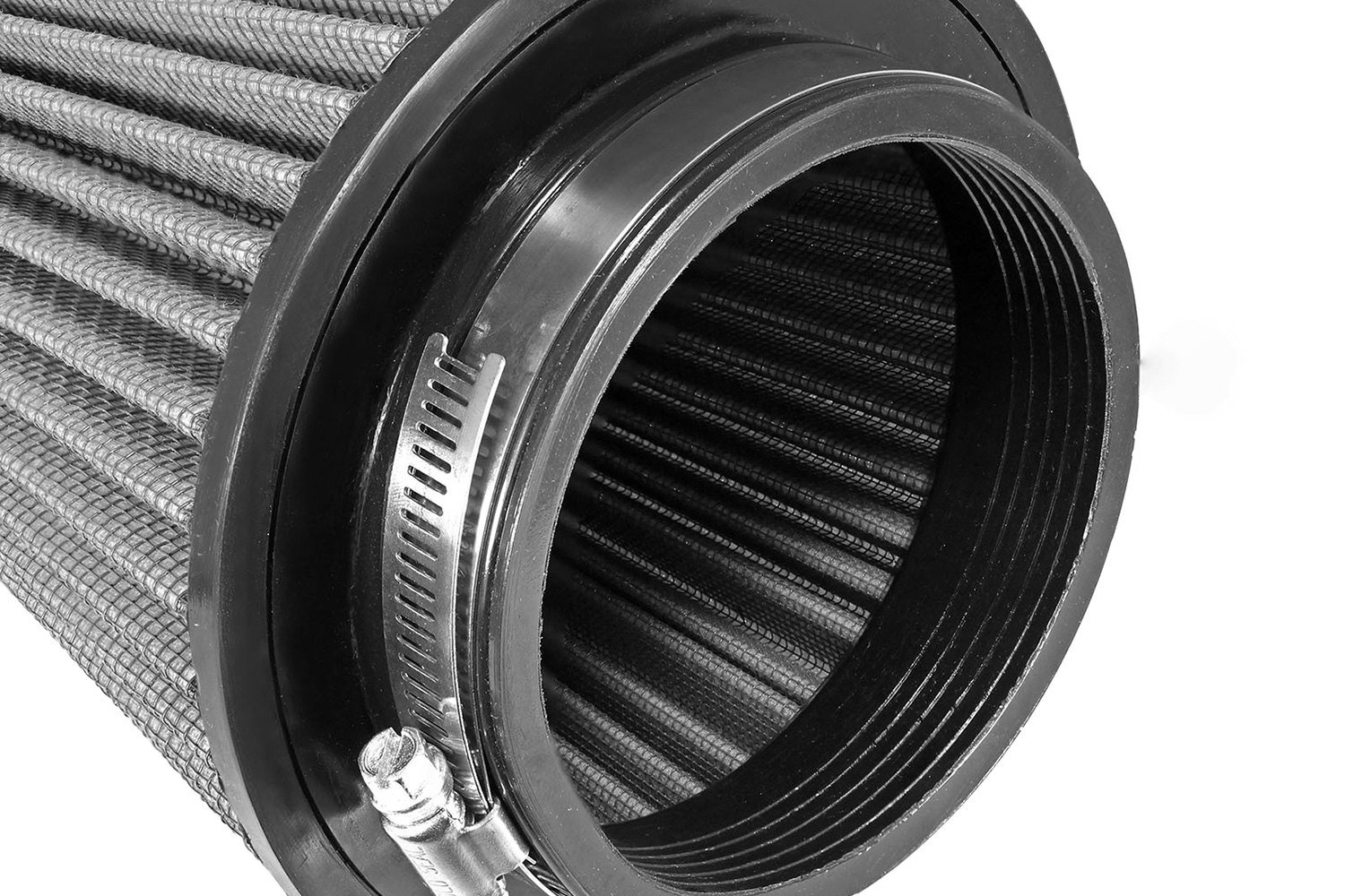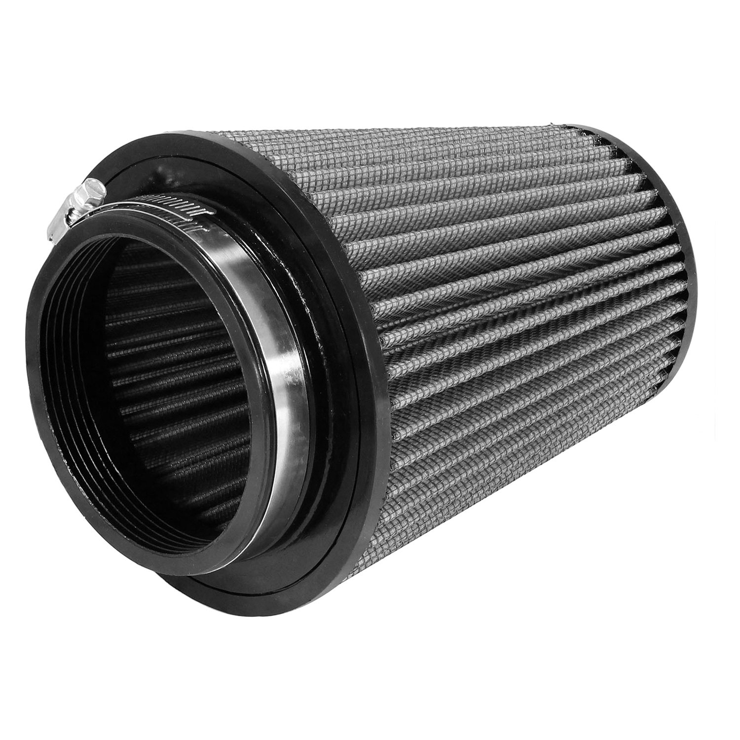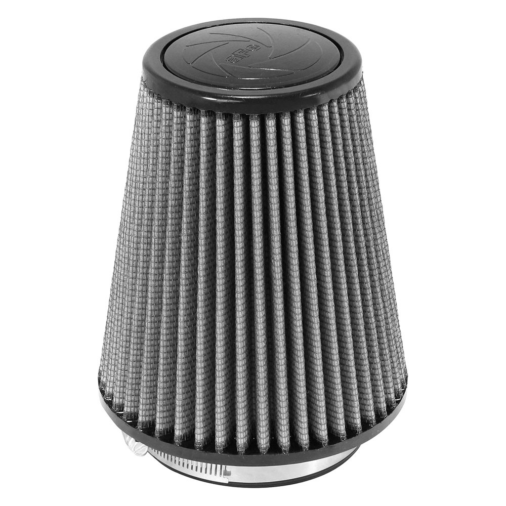 Magnum Flow® Pro Dry S Round Tapered Gray Air Filter (21-40507) by aFe®. This high flow Pro DRY S air filters are constructed with 100% polyurethane on all sides and will out flow the stock paper filters for improved performance. Layers of progressively finer synthetic media provides maximum convenience and can be cleaned with soap and water. Washable and reusable for multiple cleaning cycles, the tall, open and evenly spaced filter pleats provide excellent dust holding capacity for longer service cycle between cleanings. An integrated urethane bump seal insures a tight, leak-free seal over the life of the filter. The aFe filter system increased air flow 25% over the factory air filter set increasing horsepower, torque and improving throttle response.