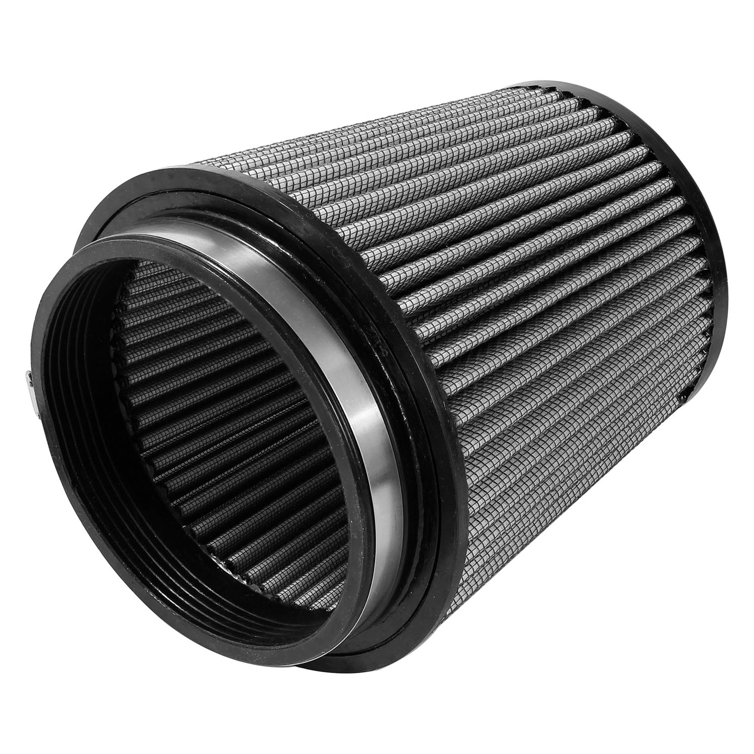 Magnum Flow® Pro Dry S Round Tapered Gray Air Filter (21-90045) by aFe®. This high flow Pro DRY S air filters are constructed with 100% polyurethane on all sides and will out flow the stock paper filters for improved performance. Layers of progressively finer synthetic media provides maximum convenience and can be cleaned with soap and water. Washable and reusable for multiple cleaning cycles, the tall, open and evenly spaced filter pleats provide excellent dust holding capacity for longer service cycle between cleanings. An integrated urethane bump seal insures a tight, leak-free seal over the life of the filter. The aFe filter system increased air flow 25% over the factory air filter set increasing horsepower, torque and improving throttle response.