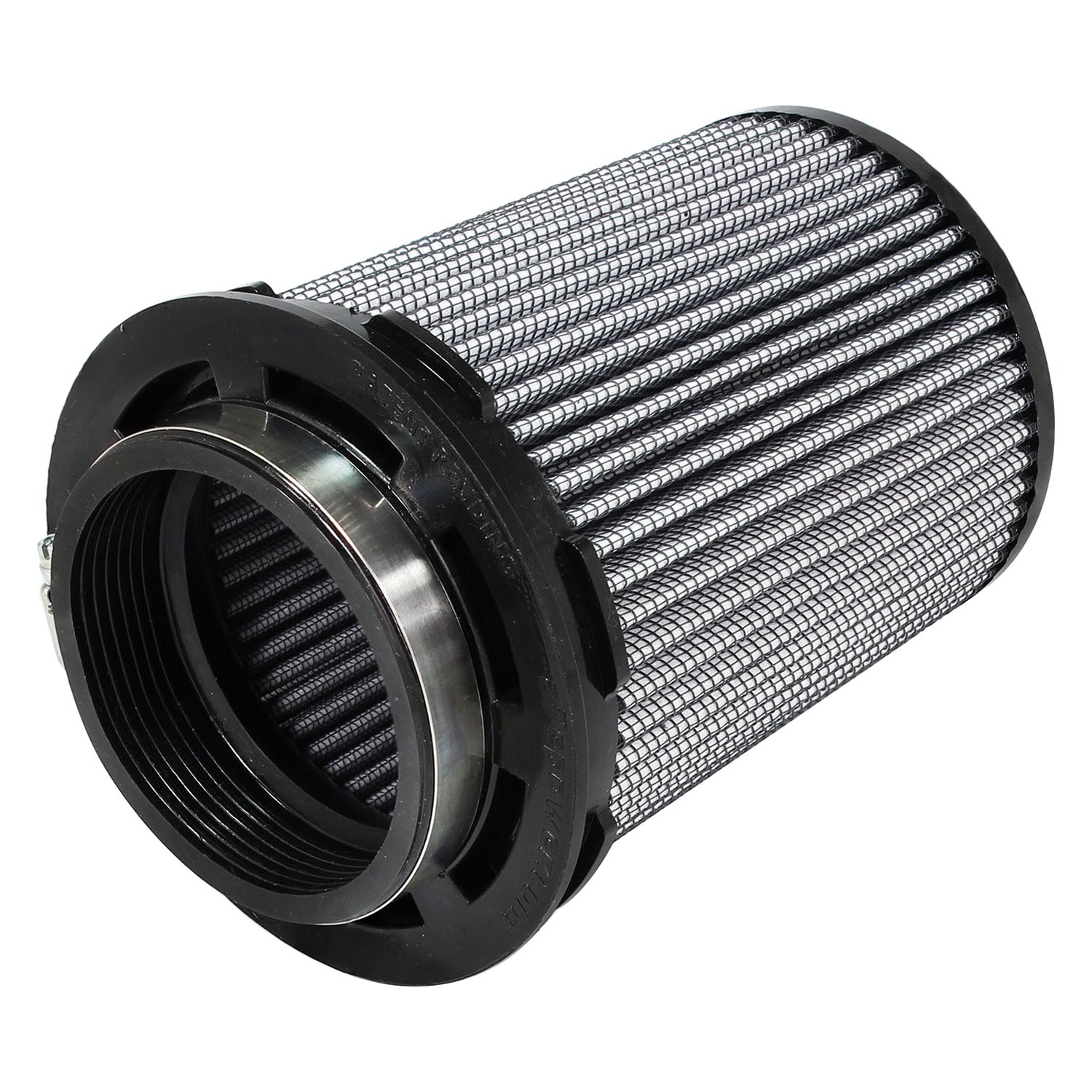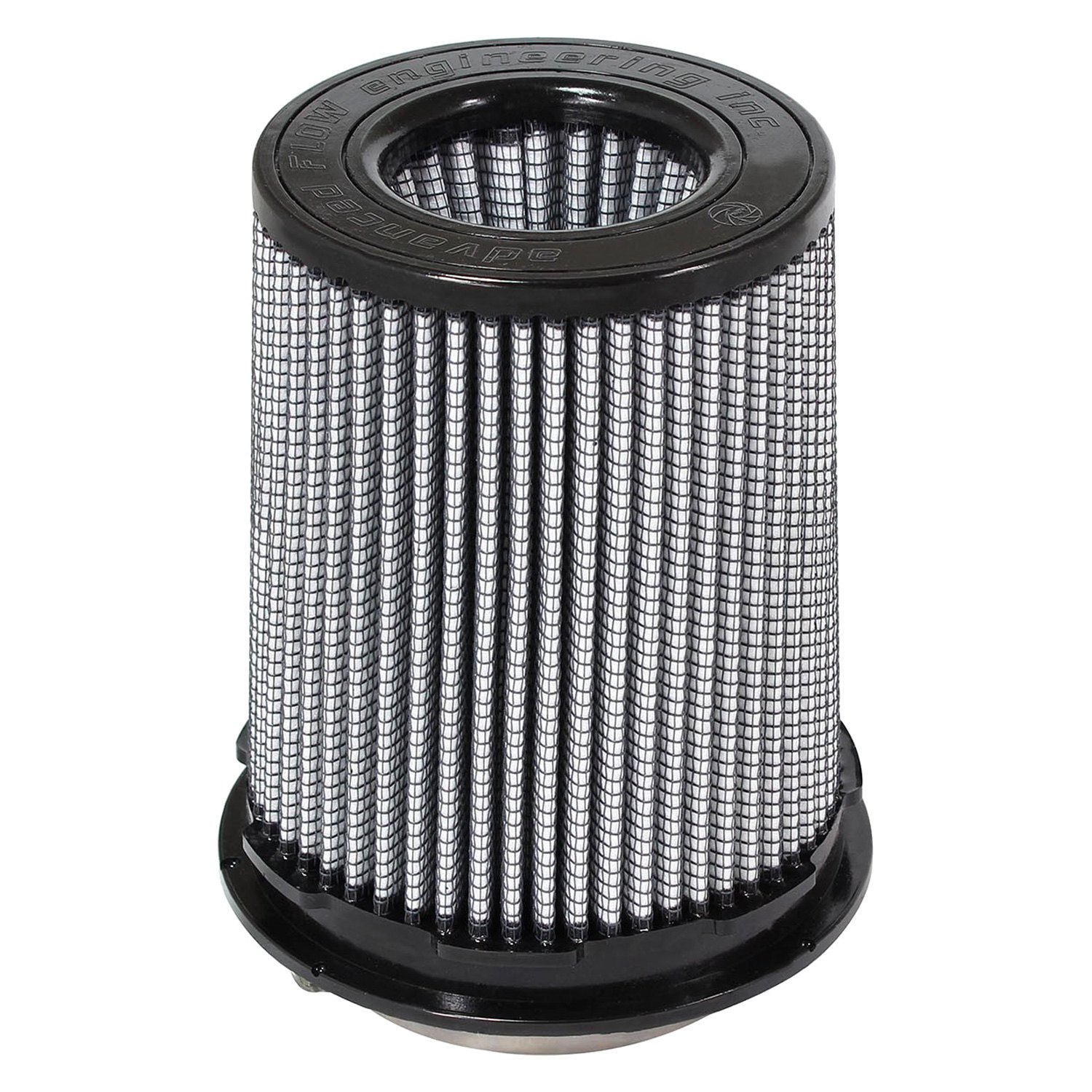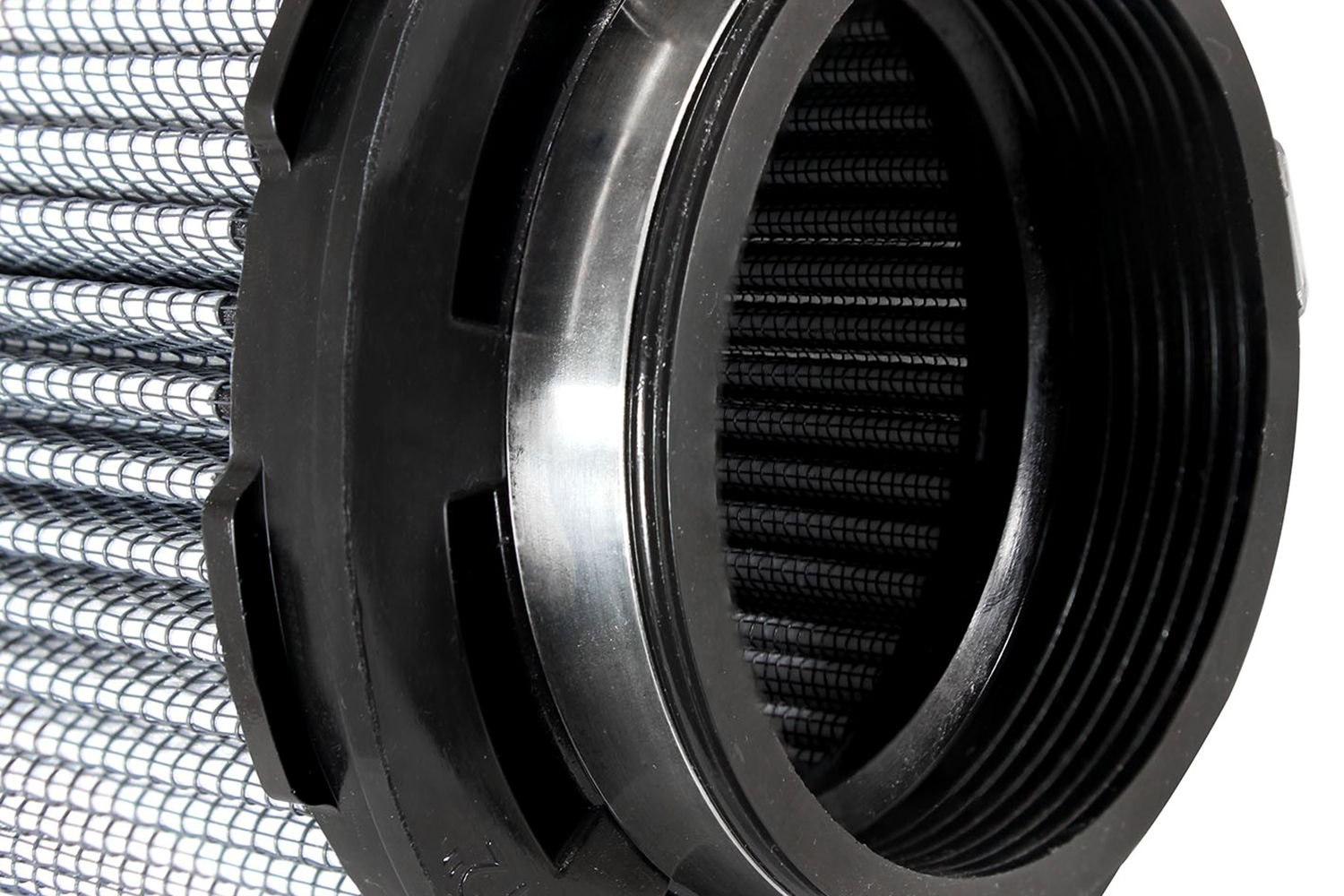 Magnum Flow® Pro Dry S Round Tapered Gray Air Filter (21-91097) by aFe®. This high flow Pro DRY S air filters are constructed with 100% polyurethane on all sides and will out flow the stock paper filters for improved performance. Layers of progressively finer synthetic media provides maximum convenience and can be cleaned with soap and water. Washable and reusable for multiple cleaning cycles, the tall, open and evenly spaced filter pleats provide excellent dust holding capacity for longer service cycle between cleanings. An integrated urethane bump seal insures a tight, leak-free seal over the life of the filter. The aFe filter system increased air flow 25% over the factory air filter set increasing horsepower, torque and improving throttle response.