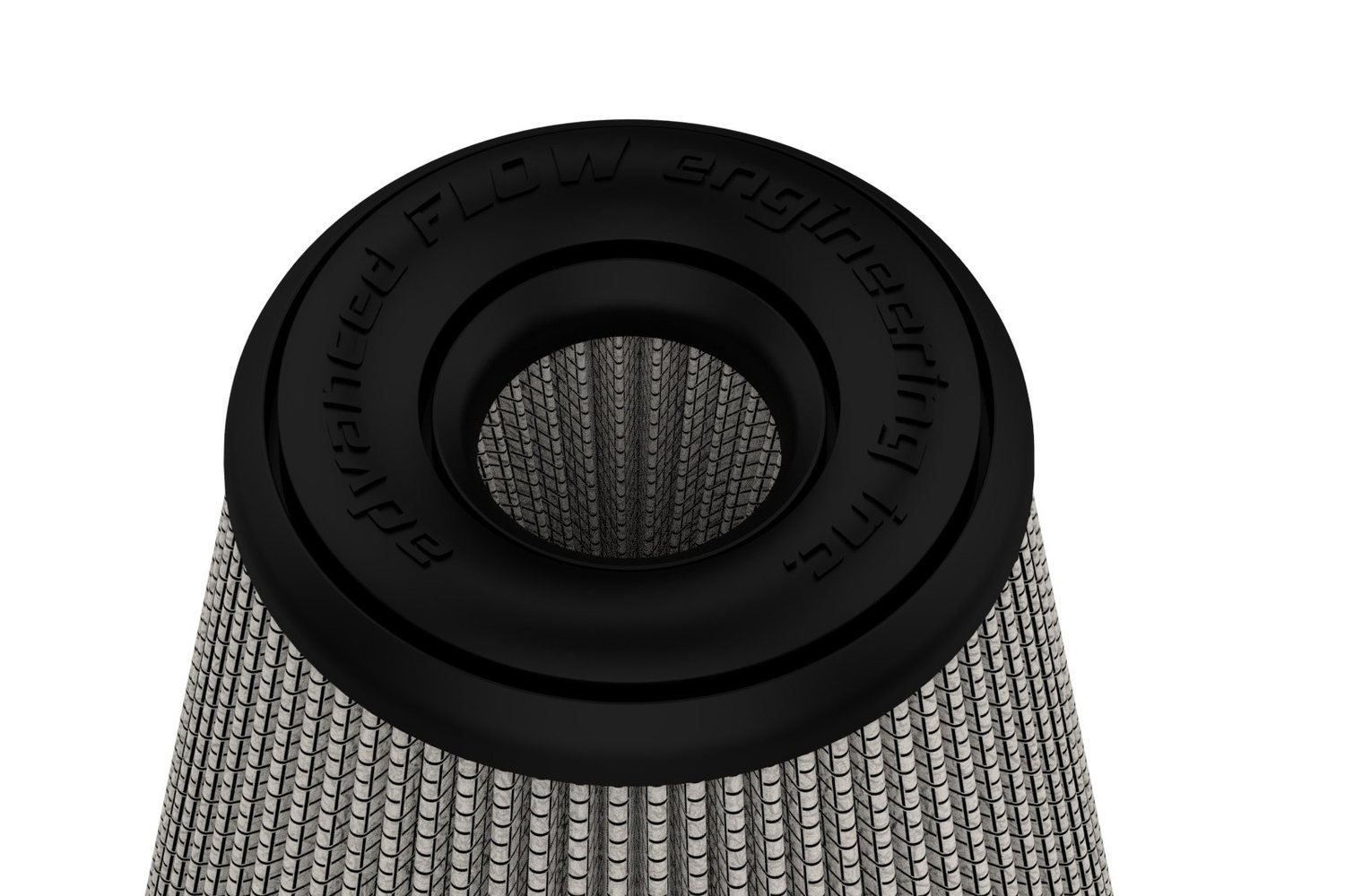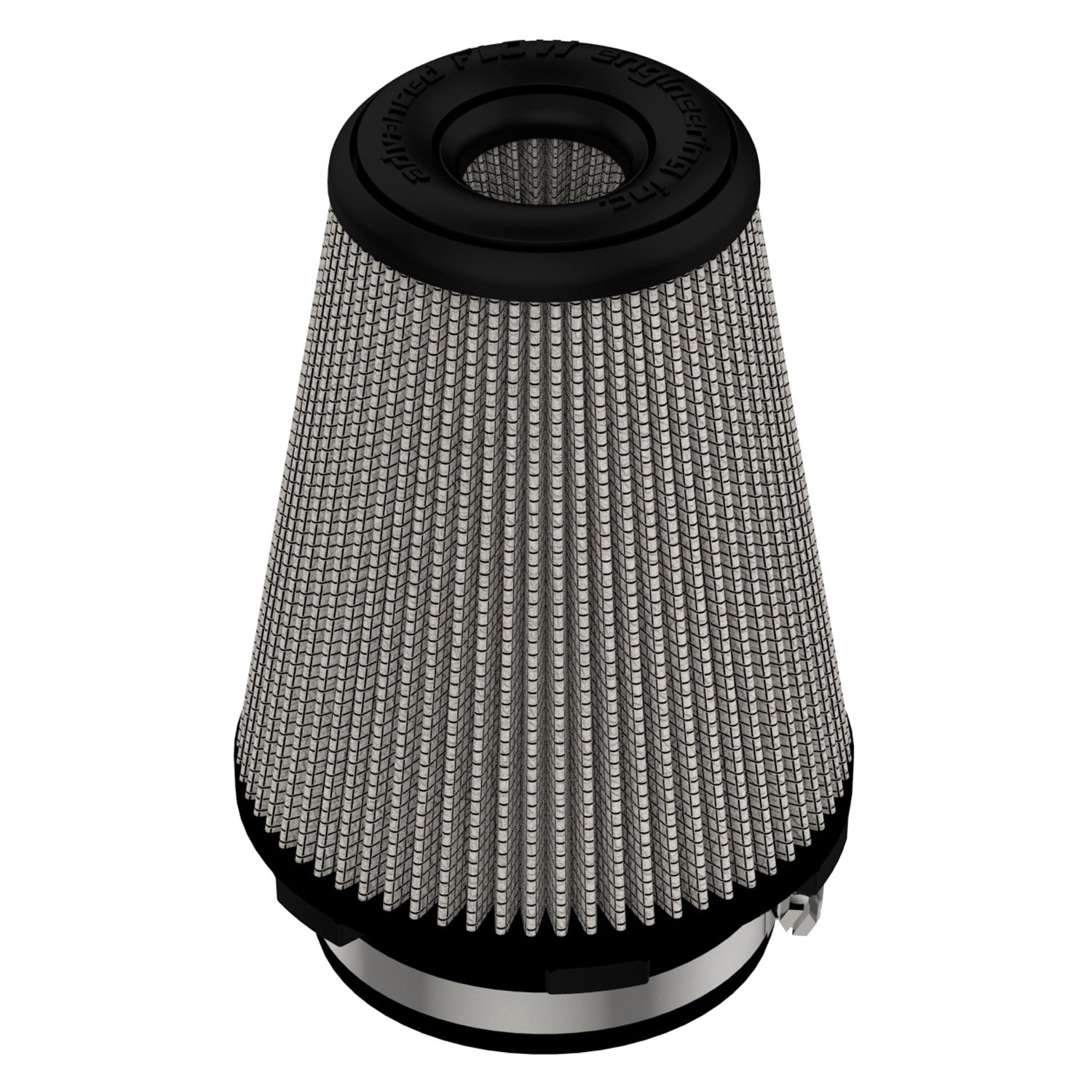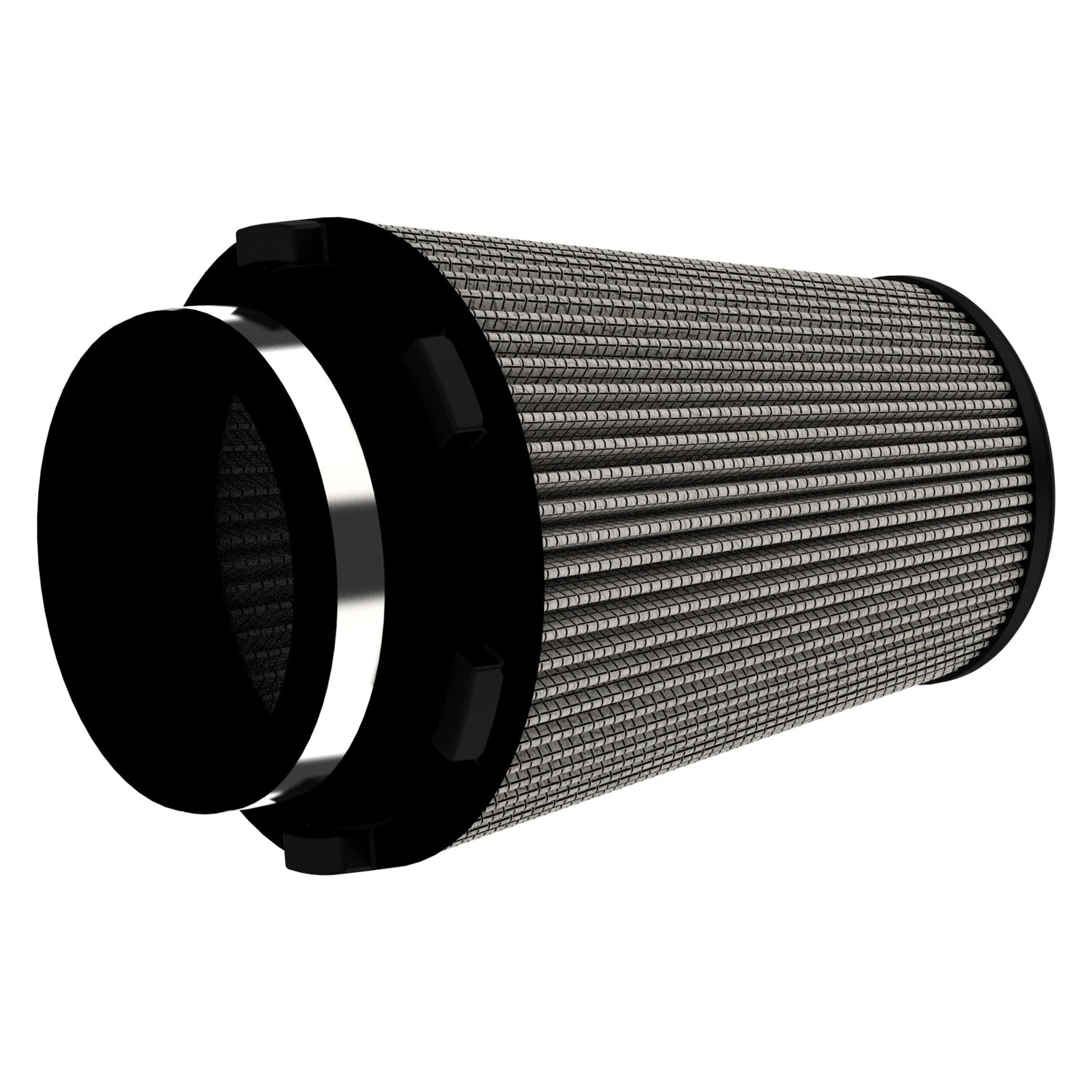 Magnum Flow® Pro Dry S Round Tapered Gray Air Filter (22-91201D) by aFe®. This high flow Pro DRY S air filters are constructed with 100% polyurethane on all sides and will out flow the stock paper filters for improved performance. Layers of progressively finer synthetic media provides maximum convenience and can be cleaned with soap and water. Washable and reusable for multiple cleaning cycles, the tall, open and evenly spaced filter pleats provide excellent dust holding capacity for longer service cycle between cleanings. An integrated urethane bump seal insures a tight, leak-free seal over the life of the filter. The aFe filter system increased air flow 25% over the factory air filter set increasing horsepower, torque and improving throttle response.