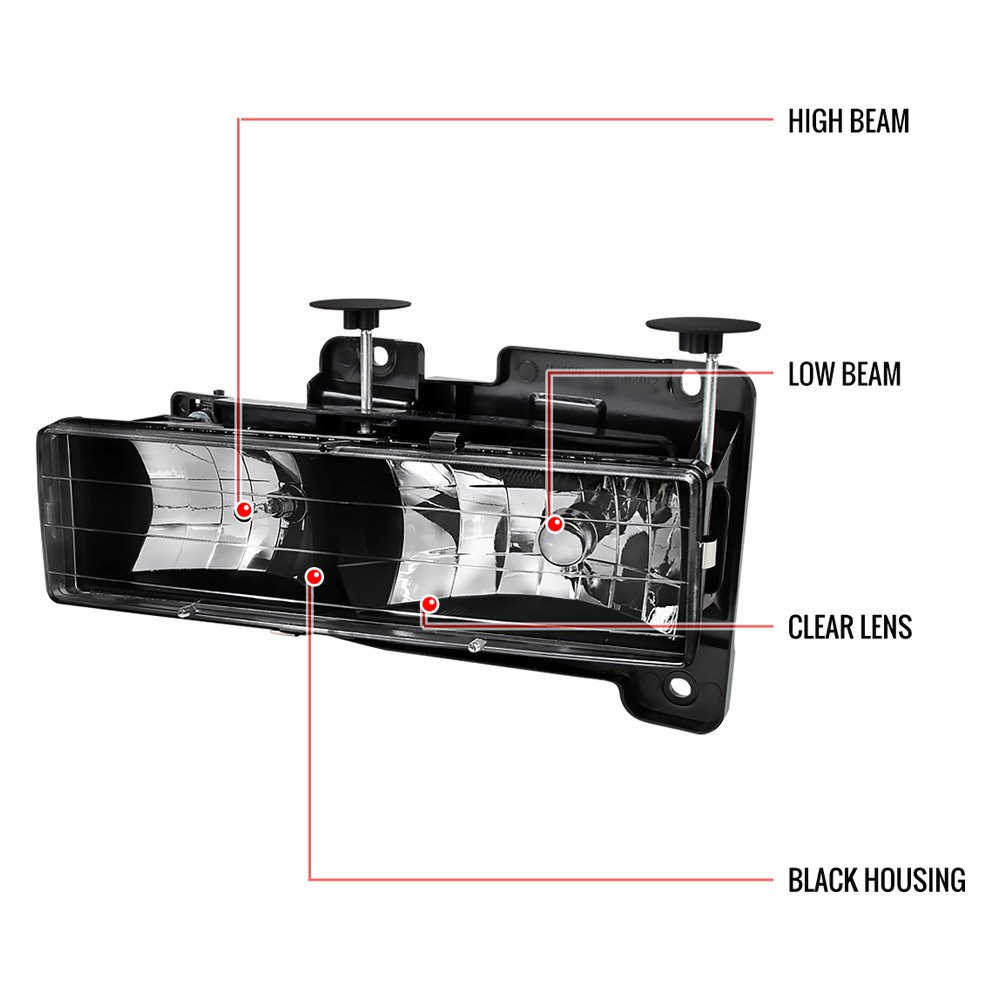 Driver and Passenger Side Euro Headlights with LED Turn Signal/Parking and Corner Lights by Spec-D®. 6 Pieces. Get improved nighttime vision and upgraded style with these bolt-on headlight assemblies. The brand new lens and multi-faceted reflector will provide brilliant illumination for safer driving, and the custom headlight housing will give your ride a unique, distinctive look.