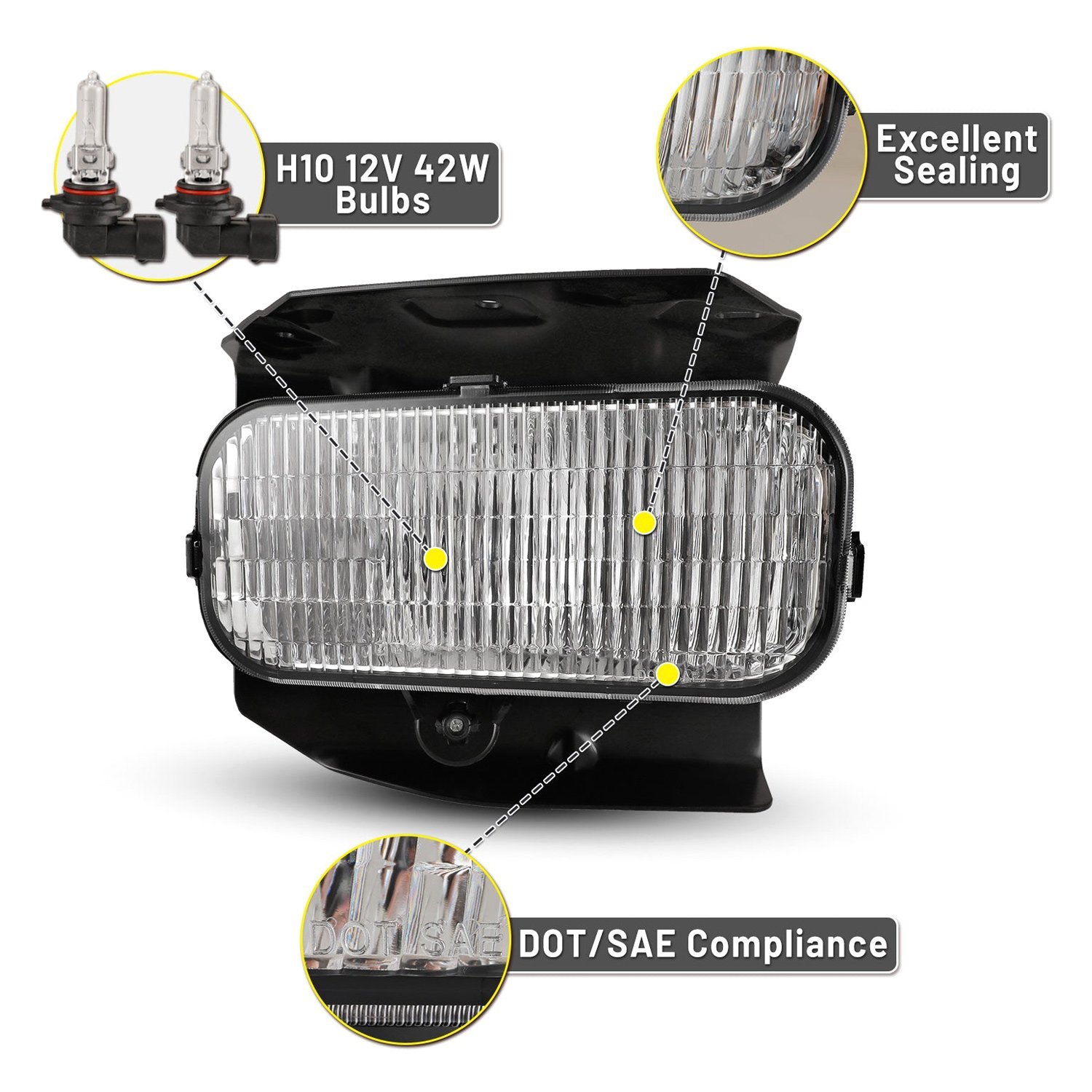 Factory Style Fog Lights (CFWJ-0181-C) by Winjet®. 1 Pair. Chrome housing, clear lens. Wiring harness, switch, relay: not included. Bulbs: H10 12V/42W (included). These premium fog lights allow for great visibility and maximum safety in bad weather conditions. Being a true copy of your OEM fog lights, these cost-effective parts will become an ideal replacement for your cracked or non-functioning units. The lights are constructed from OEM grade ABS plastic to provide long-lasting and the most reliable service.